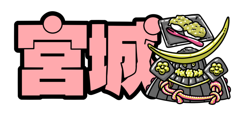 伊達政宗の兜とずんだ餅を添えた「MIYAGI」の文字イラストです。宮城県を象徴するモチーフを組み合わ […] -