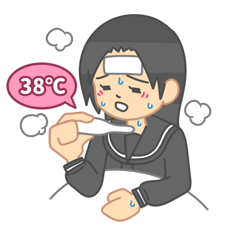 ベッドの上に座って熱を測っているきつそうなセーラー服を着た生徒のイラストです。 体調が悪く、ベッドの […] -